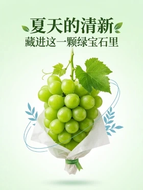 夏日水果电商海报设计,一串新鲜青提葡萄特写,果粒饱满圆润,表面光泽通透,带一片翠绿叶子,白色简约包装纸包裹,产品居中悬浮构图,浅绿色渐变背景,画面干净清爽,蓝色流线型装饰线条点缀,轻电商设计风格,高级感留白构图,柔和棚拍光线,超清细节,商业广告质感,竖版海报比例,顶部加入醒目中文标题:夏天的清新,副标题:藏进这一颗绿宝石里,字体时尚简洁,圆润现代风格,排版居中,整体配色以绿色为主